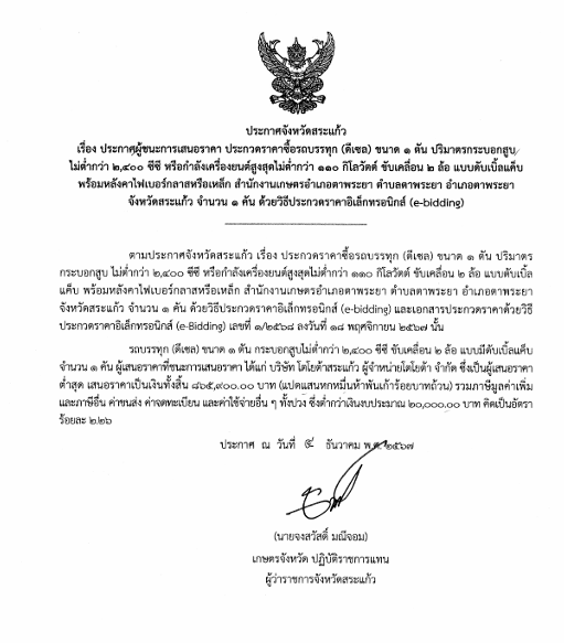 จังหวัดสระแก้ว จำนวน ๑ คัน ด้วยวิธีประกวดราคาอิเล็กทรอนิกส์ (e-bidding)