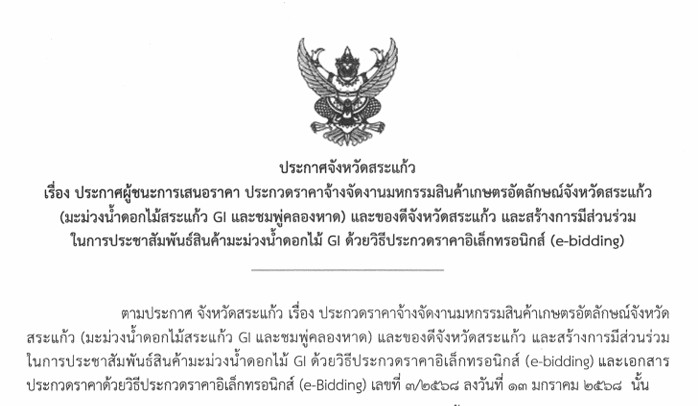 เรื่อง ประกาศผู้ชนะการเสนอราคา ประกวดราคาจ้างจัดงานมหกรรมสินค้าเกษตรอัตลักษณ์จังหวัดสระแก้ว (มะม่วงน้ำดอกไม้สระแก้ว GI และชมพู่คลองหาด) และของดีจังหวัดสระแก้ว และสร้างการมีส่วนร่วม ในการประชาสัมพันธ์สินค้ามะม่วงน้ำดอกไม้ GI ด้วยวิธีประกวดราคาอิเล็กทรอนิกส์ (e-bidding)